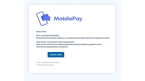 Kyberturvallisuuskeskus varoittaa Mobilepayn nimissä leviävästä huijauksesta. Huijausviestejä on lähetetty sähköpostitse.