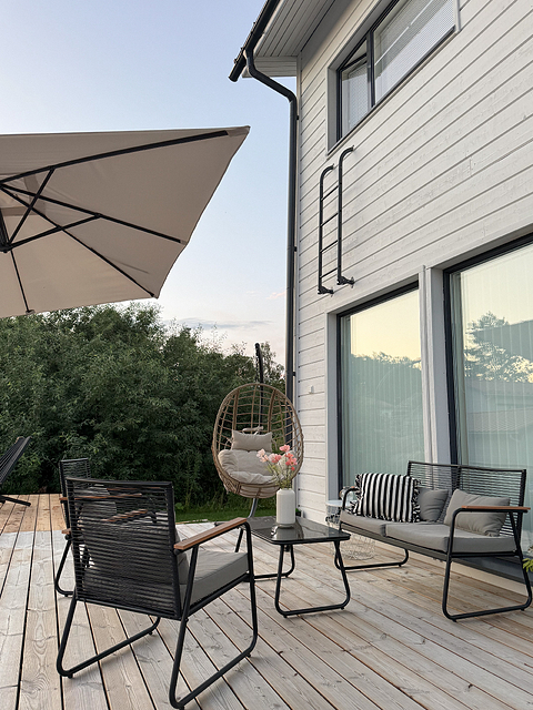 Haaveisiin mahtuu myös lasitettu terassi, jonka Selin voisi sisustaa kauniisti ja käyttää myös olohuoneen jatkeena.